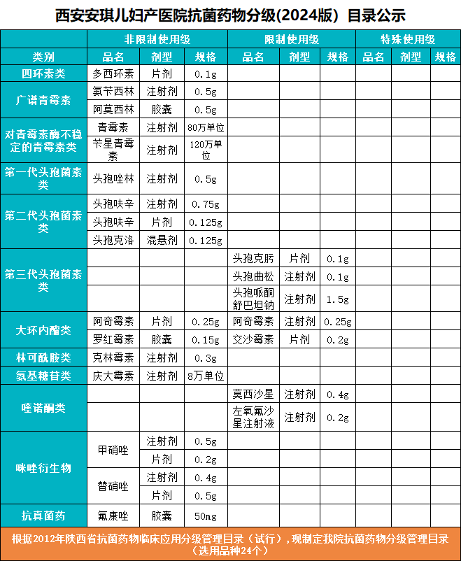 西安安琪儿妇产医院抗菌药物分级(2024版)目录公示