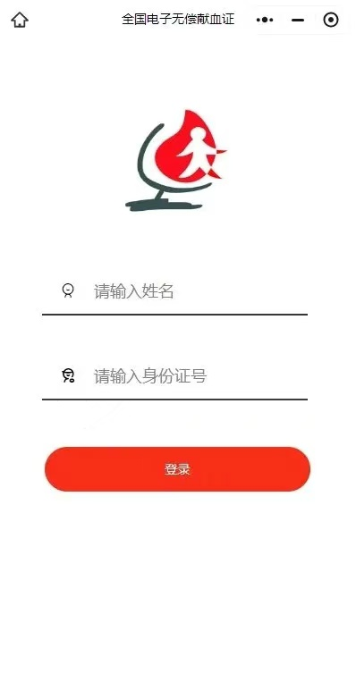 登录小程序首次进入程序时,需要点击任意功能点进入登陆页面。输入姓名、身份证号后,即可登陆全国电子献血证小程序。登陆页面见图 1。